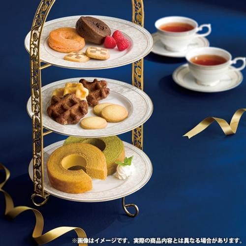 表面にパールシュガーをつけて焼きあげたベルギーワッフルの他にやクッキー、バウムクーヘン等の焼き菓子を盛り合わせたアソートです。